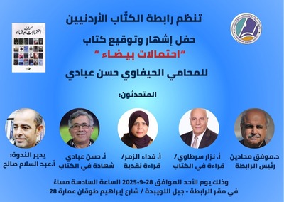 وقع الكاتب المحامي الحيفاوي حسن عبادي كتابه الجديد "احتمالات بيضاء-قراءات في أدب الحرية الفلسطيني" على منصة التوقيع في أروقة معرض الكتاب الدولي في عمان، وذلك يوم الجمعة 26/9/2025، ليتبع ذلك احتفاليتان مستقلتان لإشهار الكتاب، حضرهما جمع من الكتاب والمثقفين والمهتمين بأدب الحريّة، كانت الأولى في مقر رابطة الكتاب الأردنيين في إربد يوم السبت 27/9/2025، شارك فيها نخبة من الكتاب والأدباء، بالإضافة إلى عريف الحفل الروائي محمد مجدلاوي، مرحبا بالضيوف، ومعرّفا بالكتاب.