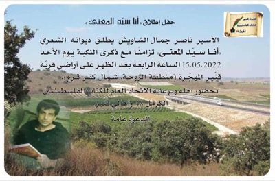 حفل إطلاق ديوان "أنا سيد المعنى" للصديق الأسير ناصر الشاويش، تزامنًا مع ذكرى النكبة وعلى أراضي قنّير المهجّرة، تلك القرية التي هُجّر منها أهله إثر النكبة، رغم قانون النكبة المقيت الذي سنّه برلمان الكيان.