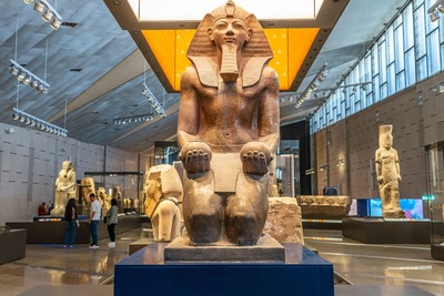 وقد اكتمل تشييد مبنى المتحف والذي تبلغ مساحته أكثر من 300 ألف متر مربع خلال عام 2021 ليتضمن عدد من قاعات العرض والتي تعتبر الواحدة منها أكبر من العديد من المتاحف الحالية في مصر والعالم ويُعد المتحف أحد أهم وأعظم إنجازات مصر الحديثة فقد أُنشئ ليكون صرحاً حضارياً وثقافياً وترفيهياً عالمياً متكاملاً وليكون الوِجهة الأولى لكل من يهتم بالتراث المصري القديم كأكبر متحف في العالم يروي قصة تاريخ الحضارة المصرية القديمة حيث يحتوي على عدد كبير من القطع الأثرية المميزة والفريدة من بينها كنوز الملك الذهبي توت عنخ آمون والتي تُعرض لأول مرة كاملة منذ اكتشاف مقبرته في نوفمبر 1922 بالإضافة إلى مجموعة الملكة حتب حرس أم الملك خوفو مُشيد الهرم الأكبر بالجيزة وكذلك متحف مراكب الملك خوفو فضلاً عن المقتنيات الأثرية المختلفة منذ عصر ما قبل الأسرات وحتى العصرين اليوناني والروماني