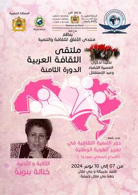 ينظم منتدى الآفاق للثقافة والتنمية بخريبكة، فعاليات الدورة الثامنة لملتقى الثقافة العربية، من 7 إلى 10 نونبر 2024 بإقليمي خريبكة وبني ملال (جهة بني ملال خنيفرة)، تخليدا لذكرى المسيرة الخضراء المظفرة، وعيد الاستقلال المجيد.