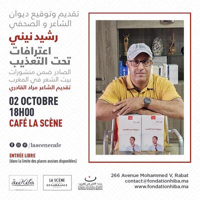 يُنظّمُ بيت الشعر في المغرب والفضاء الثّقافي لمقهى النهضة بالرباط لقاءً ثقافيا وشعريّا مع الشّاعر والصحفي رشيد نيني، احتفاءً بتجربته في مجال الإبداع والإعلام، وكذا لتقديم وتوقيع ديوانه "اعترافات تحت التعذيب" الصّادر مؤخرا عن منشورات بيت الشعر في المغرب.