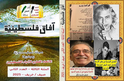 جاءنا من النّاطق الرّسميّ للاتّحاد القطريّ للأدباء الفلسطينيّين، الشّاعر علي هيبي: أصدر الاتّحاد القطريّ للأدباء الفلسطينيّين في أوائل تشرين الأوّل من هذا العام العدد السّادس من مجلّته "آفاق فلسطينيّة" وهو الثّاني، عدد صيف/ خريف للعام 2025، وقد صدر بمئتيْن وأربعين صفحة من القطع المتوسط، عن شركة "ابن خلدون للطّباعة والنّشر" في مدينة "طولكرم" المحتلّة. وقد جاء العدد مزيّنًا بغلافه الأماميّ المعهود وبغلاف خلفيّ حمل صورًا لأدباء المقاومة الفلسطينيّين والعرب والعالميّين وبعضا من أشعارهم ومقولاتهم الشّهيرة، وهم: الشّاعر الفلسطينيّ، علي فودة وقصيدته "لم أمت بعد" والشّاعر الجزائريّ العروبيّ، مالك حدّاد ومقولته: "تفصلني الفرنسيّة عن وطني أكثر ممّا يفصلني البحر الأبيض المتوسّط" والكاتب الكولومبيّ العالميّ جبرئيل غارسيا ماركيز ومقولته: "لا يولد البشر مرّة واحدة يوم تلدهم أمّهاتهم، فالحياة ترغمهم على أن ينجبوا أنفسهم".