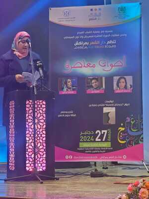 أما الشاعرة خديجة امجوض، القادمة من عاصمة ألق لغة الضاد تارودانت، المدينة التي أنجبت العديد من شعراء القصيدة العمودية والذين أمسوا يشكلون ألقها في العديد من المهرجانات والتظاهرات الوطنية والعربية، اختارت نصا يحتمي باللغة من وجع الزمن: "ماذا أقول وكيف أفصح بعدما/سبقت إلى نبع القديم وعول// النبع جف ولم أرج أساوري/ حتى يشف قميصي المبلول// بالفجر كنت إذا لمست قصيدة/ صارت كروما من يديّ تسيل// والليل كانت في يديّ نجومه/ ترتاح حين يحوزها أيلول// لم يبق برق في سواد ضفائري/ ماعاد في صدر الربيع خميل..".