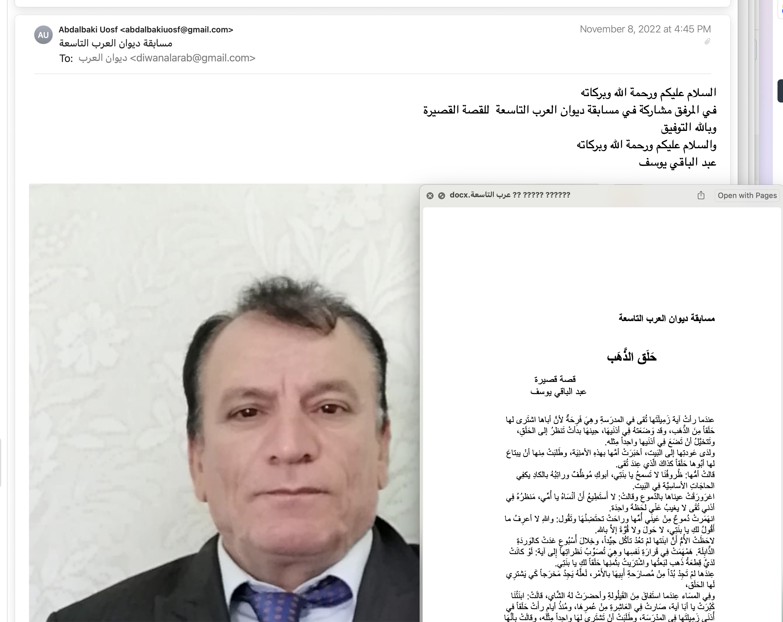 تؤكد ديوان العرب أن الكاتب السوري عبد الباقي يوسف قد شارك في مسابقة ديوان العرب التاسعة في تشرين ثاني عام ٢٠٢٢ بقصة عنوانها (حلق الذهب) مرفق نص رسالته.