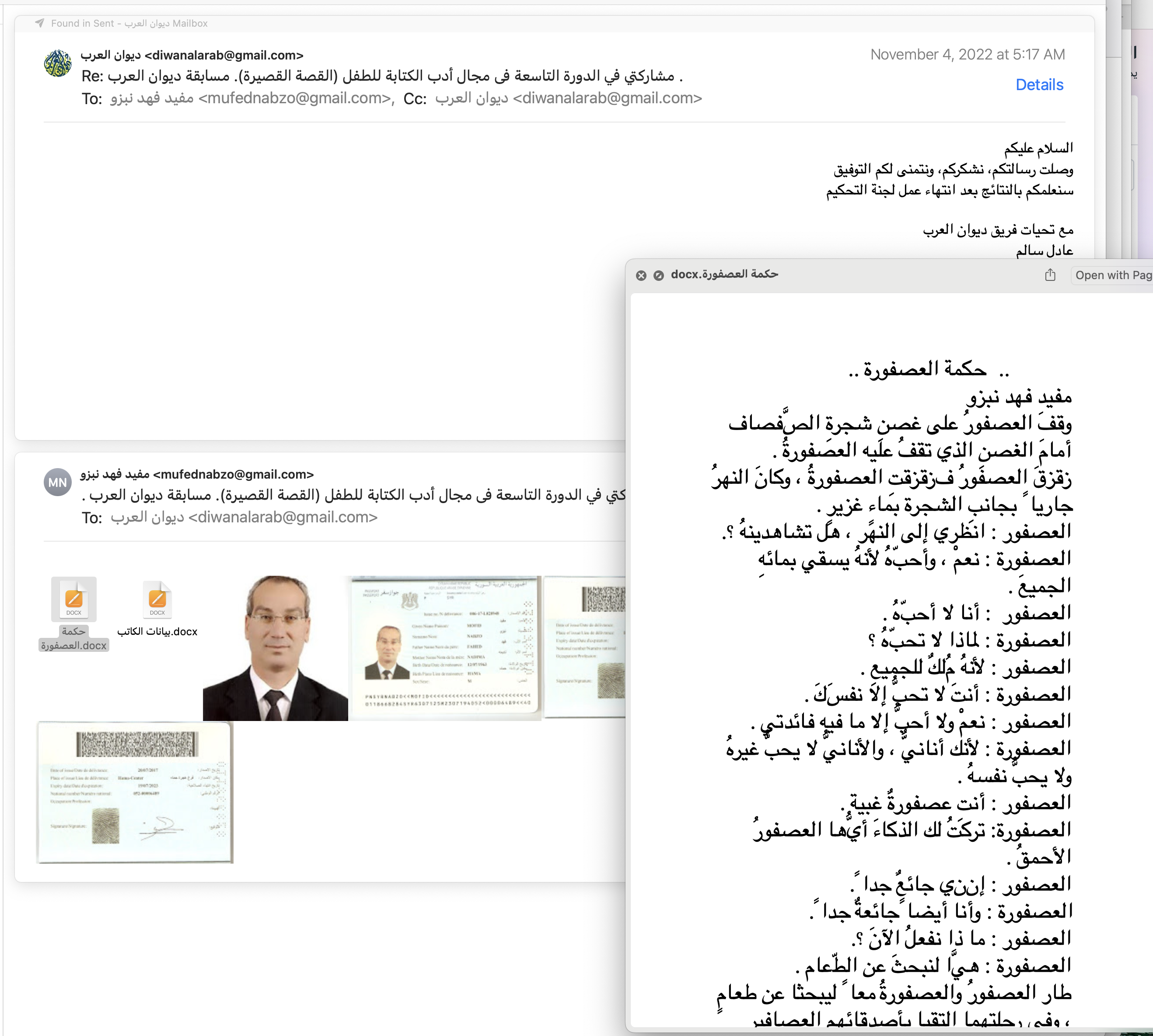 بالعودة لكافة رسائل الكاتب مفيد نبزو اتضح أنه لم يرسل لنا أية رسالة فيها النص المذكور (حلق الذهب)، وأن القصة التي شارك فيها كانت بعنوان (حكمة العصفورة) مرفقة بكافة بياناته، وصورة جواز سفره.