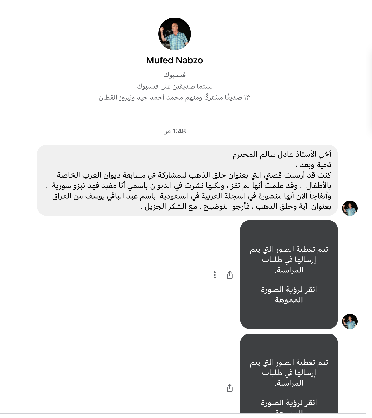 كما شارك الكاتب السوري مفيد نبزو في نفس المسابقة في قصة بعنوان (حكمة العصفورة) كان قد أرسلها في تشرين أول ٢٠٢٢ مرفق الرسالة، ولم يرسل لنا للنشر أية قصة تحمل عنوان (حلق الذهب).