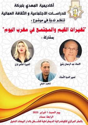 تعقد أكاديمية المهدي بنبركة للدراسات الاجتماعية والثقافة العمالية ندوة في موضوع’’ تغيرات القيم والمجتمع في مغرب اليوم’’، وذلك يوم السبت 1 فبراير 2025 في الساعة الرابعة عصرا بمقر الكونفدرالية الديمقراطية للشغل، حي النخيل الدار البيضاء، بمشاركة عبد الرحمن رشيق وإخلاص فران وتنسيق شعيب حليفي.