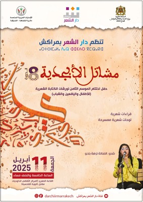تنظم دار الشعر بمراكش فعاليات الدورة الثامنة لملتقى "مشاتل الأبجدية" بفضاء القاعة الصغرى بالمركز الثقافي الداوديات، احتفاء باختتام الموسم الثامن لورشات الكتابة الشعرية (للأطفال واليافعين والشباب) 2024/2025، وذلك يوم الجمعة 11 أبريل 2025 على الساعة الخامسة والنصف مساء. وتشهد الفعاليات، والتي تعرف مشاركة مرتفقي ومرتفقات الورشات أطفالا ويافعين وشباب، مشاركة مرتفقي المؤسسات التعليمية والثقافية ونقط القراءة العمومية، في احتفاء خاص يقدمون خلالها إنتاجاتهم الإبداعية. كما يفتتح الملتقى بتنظيم معرض تشكيلي للفنانة زكية العاقب، الى جانب تقديم لوحات شعرية ممسرحة، وقراءات شعرية للعديد من الشعراء الشباب وحفل فني من تقديم الفنانة نزهة بلحو.