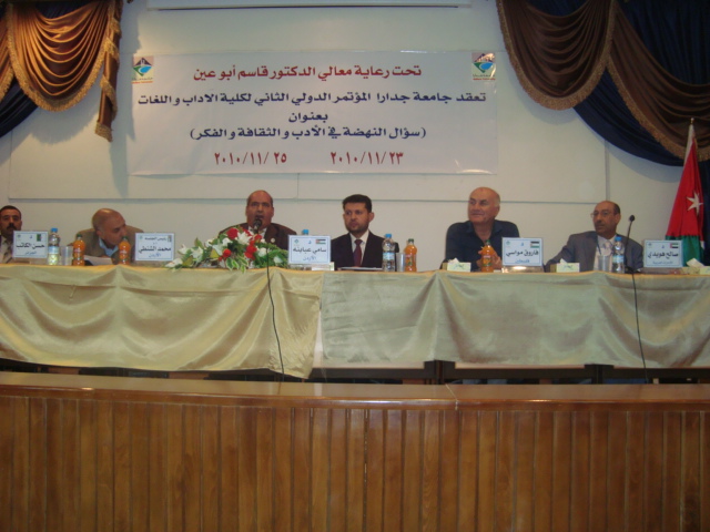 نظمت كلية الآداب في جامعة جدارا، بإربد، مؤتمرها الدولي الثاني، تحت عنوان «سؤال النهضة في الأدب والفكر والثقافة»، بين 23-25 من تشرين الثاني 2011، وذلك تحت رعاية العين قاسم أبو عين- وزير الثقافة الأردني السابق.