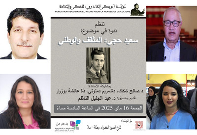 تعقد مؤسسة أبو بكر القادري للفكر والثقافية، ندوة وطنية، بمناسبة صدور طبعة جديدة من الكتاب الذي وثّق فيه أبو بكر القادري لسيرة صديقه ورفيق دربه سعيد حجي(1912-1942) عبر تقديم دراسة عن حياته ونشاطه الثقافي والسياسي وتجميع نماذج من إنتاجه المتنوع، وذلك يوم الجمعة 16 ماي 2025 في الساعة السادسة مساء بمقر المؤسسة بسلا والكائن بشارع السيرة الخضراء بطانة.