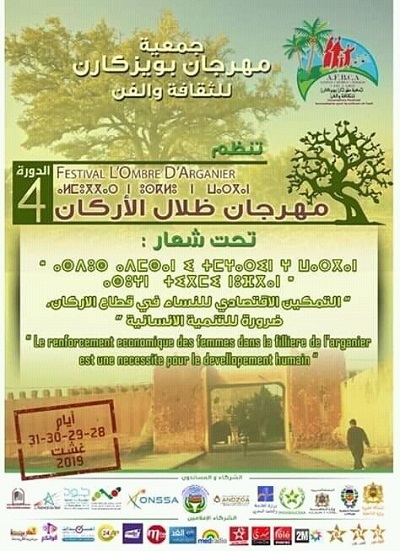 تحتضن مدينة بويزكارن بإقليم كلميم، مهرجان ظلال الأركان في نسخته الرابعة أيام 28 _29 _ 30 _ 31 غشت 2019 ، تحت شعار : التمكين الاقتصادي للنساء في قطاع الأركان، ضرورة للتنمية الانسانية” فعاليات المهرجان ستعزز بالدرجة الأولى الإقتصاد الذي يشمل العنصر النسائي المغربي وخصوصا المنخرطات في التعاونيات التي تهتم بشجرة الأركان التاريخية بالجنوب.