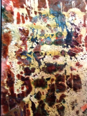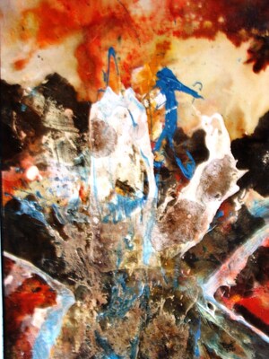 من اللوحة الأولى يشدنا الفنان إلى ثورة كأنها براكين غضب، تمتزج فيها الألوان بقوة، مزيج بين الباردة والحارة، وبين لون الأرض والتراب، مع بروز الأزرق اللازوردي في الزوايا المختلفة. في منتصف اللوحة ينتصب تجريد كأنه جسد إنسان، رأسه كتلة من نار كأنها بركان يتصاعد حتى يشكّل خلفية اللوحة. لا أيادٍ للجسد، وعلى كتفه تجريد آخر يقابله، حيث نرى ضربات قوية بالفرشاة أشبه بتلافيف دماغ أو قطع متناثرة من الفطر البني. في أرجاء اللوحة تجريد لمبانٍ وأشخاص يوحي بأن الجميع يدور في مدارات تيه، وخلفهم انفجار بركاني.