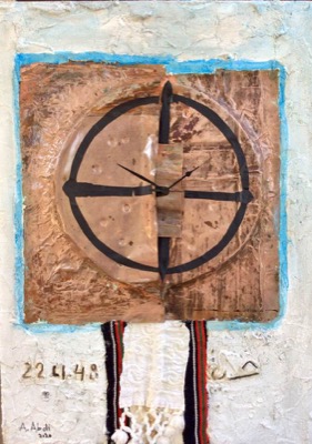 جديد، يفاجئنا به، ويُبدع في انجازه بورشته المتألقة، الفنان الفلسطيني عبد عابدي الصامد على أرض الوطن في مدينة حيفا، يقدم لنا ساعة مأذنة مسجد (الجرينه) في المدينة، فالتهجير لأهالي وابناء المدينة حصل يوم 22-4-1948 بفعل خطة (المقص) لقوات الهاجناه، تحت سمع وبصر وتواطىء قوات الإنتداب البريطاني. (العمل: ذاكرة بصرية استعيد استحضارها بعد مضي 72 عاماً من النكبة)، استخدم به رقائق نحاس على فرنير.